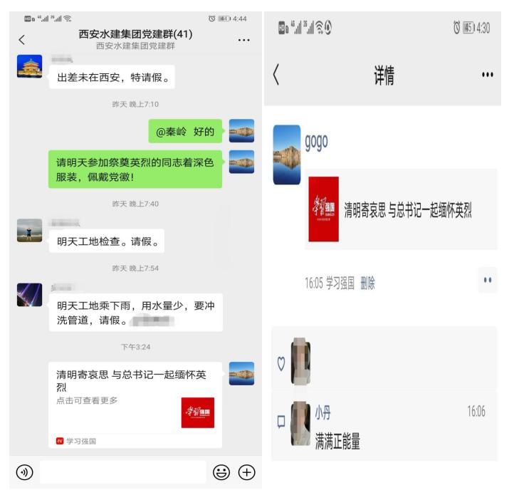 縷縷春風(fēng),綿綿細(xì)雨,說不及對革命烈士的無限深情,道不盡對烈士英魂的無盡哀思。在黨支部書記的宣傳呼吁下,公司職工紛紛參與了學(xué)習(xí)強(qiáng)國平臺關(guān)于“清明寄哀思 與總書記一起緬懷英烈”的微信轉(zhuǎn)發(fā)活動,并在黨建學(xué)習(xí)群進(jìn)行了宣傳轉(zhuǎn)發(fā),自覺放平手機(jī),為英烈默哀一分鐘。